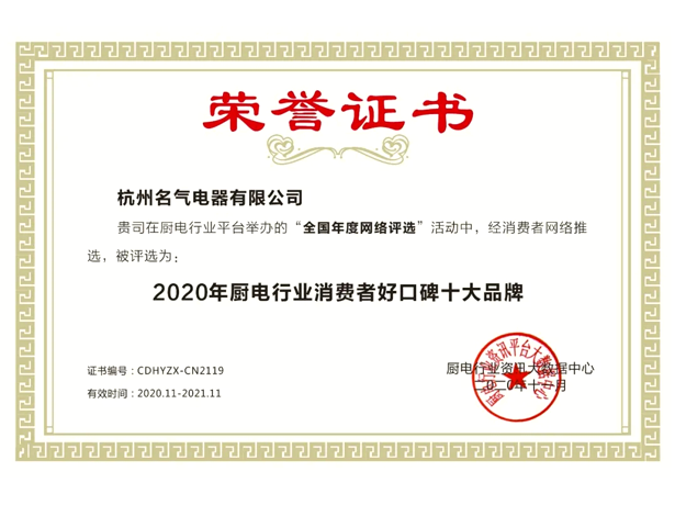 2020年廚電行業(yè)消費者好口碑十大品牌