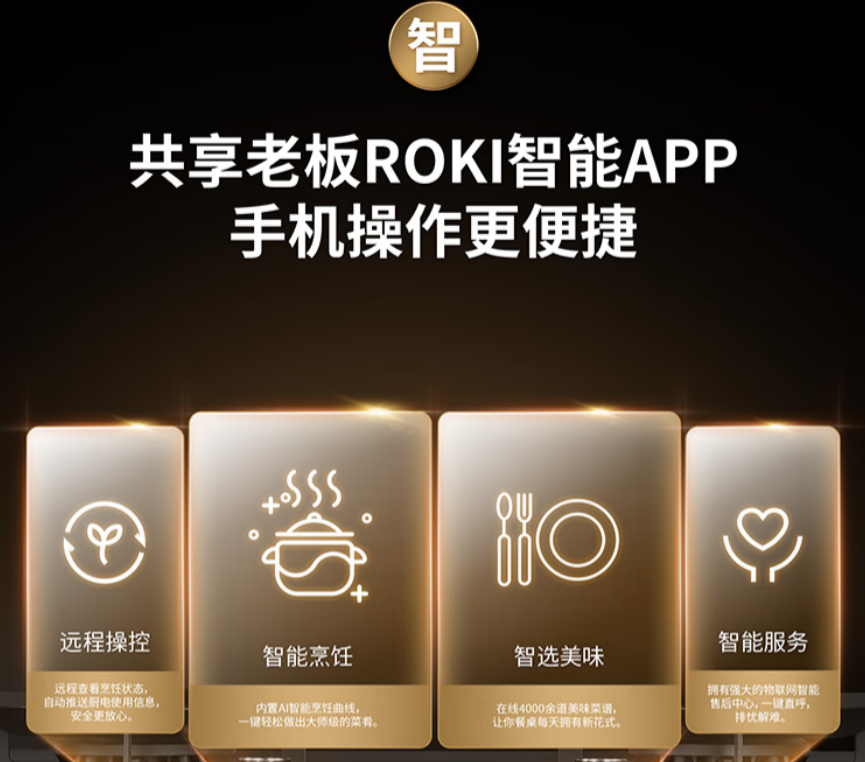 值得一提的是,在93系新品蒸烤炸一體集成灶939FT上,我們既看到了1100Pa大風壓、20m3/min大吸力以及5.2KW大火力等高性能參數,同時還看到了全面搭載的老板電器ROKI智能烹飪系統。
