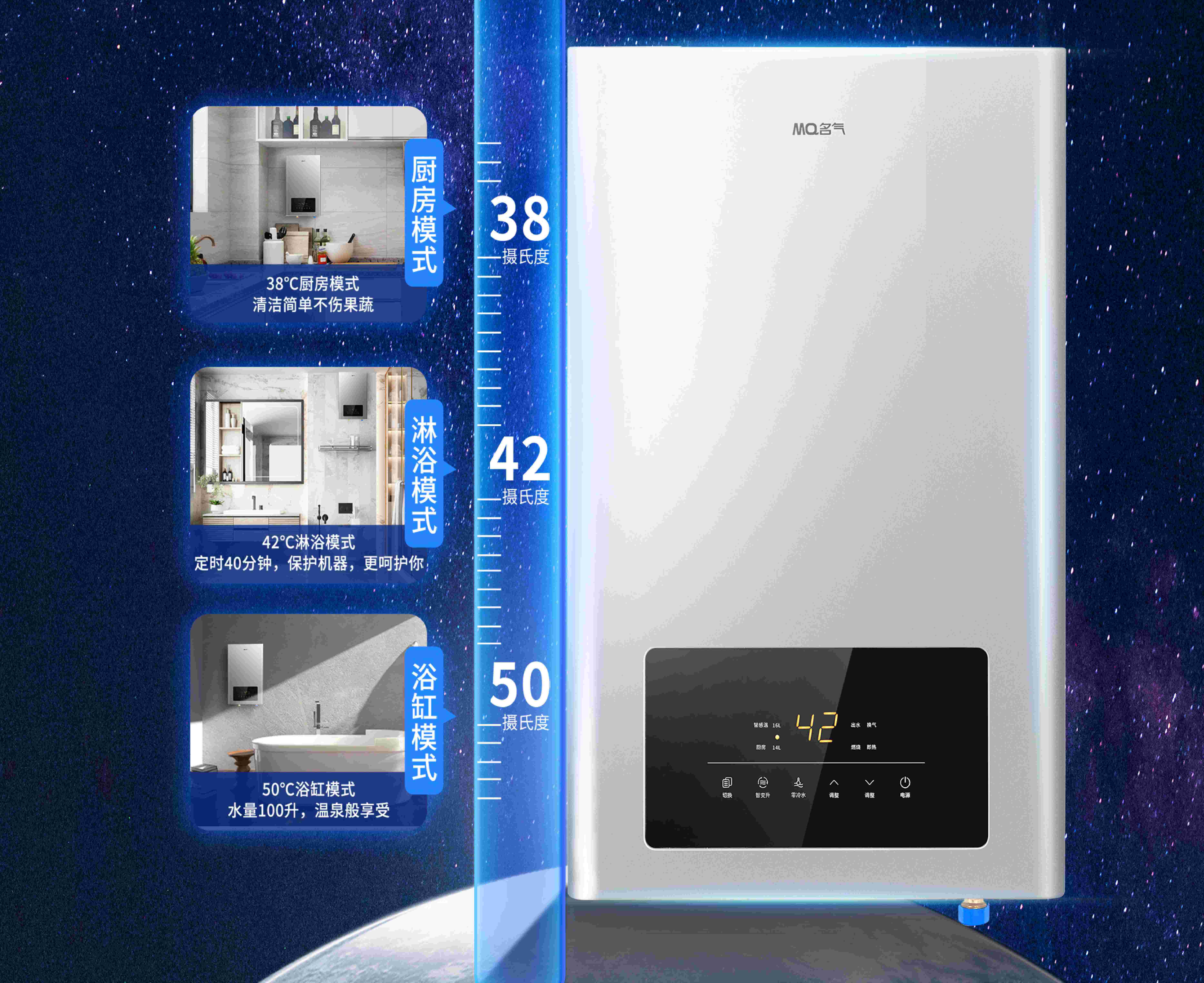 智能識別用水環境、管路長度和自動調節燃氣,10s內開關水龍頭3次,35℃~65℃區域范圍,想洗就洗免顧慮